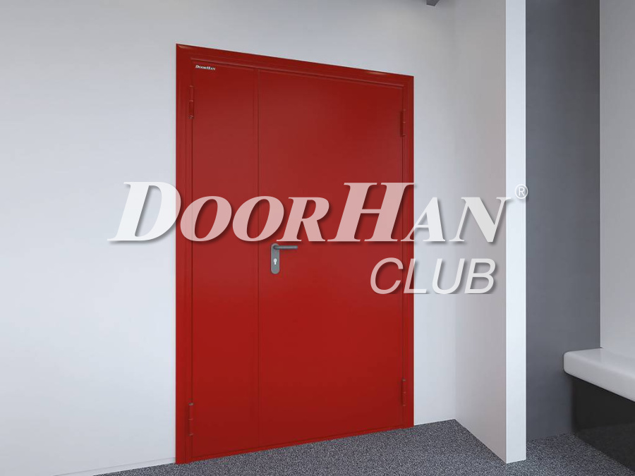 Двери DoorHan противопожарные двухстворчатые глухие EI 60 RAL7035(серый), накладная рама, ручка на планке черная нейлон, м/р 72 мм, цилиндр "ключ-ключ"